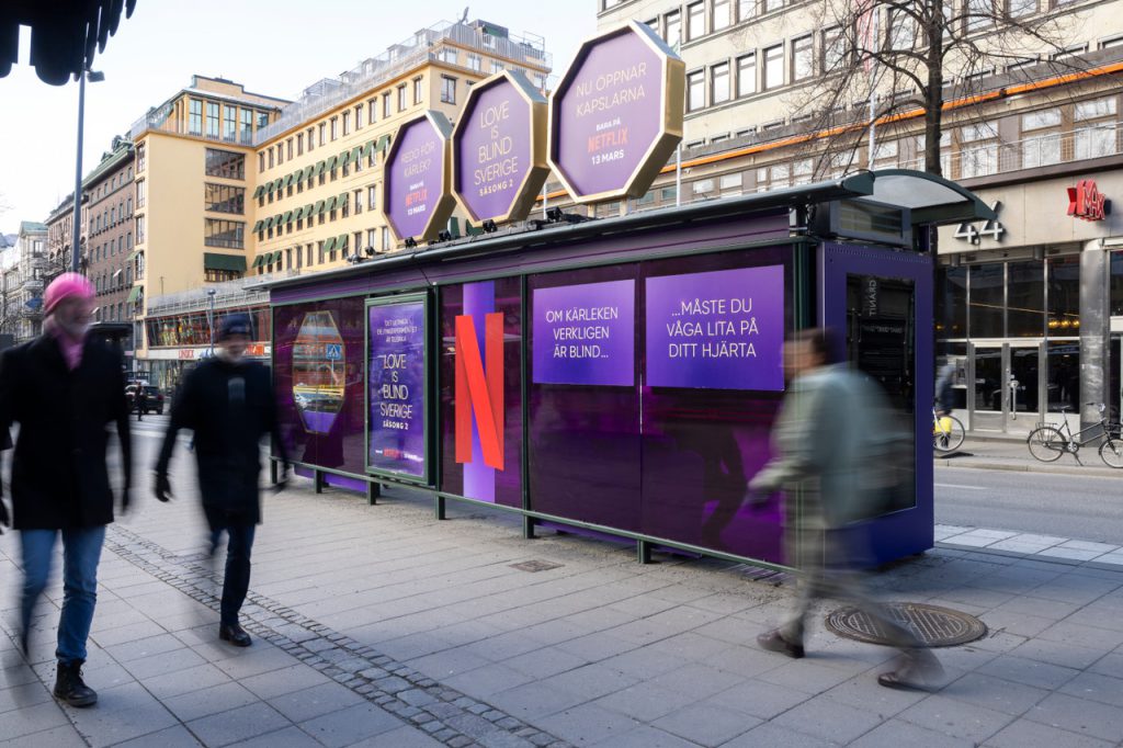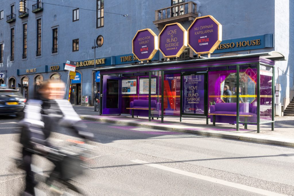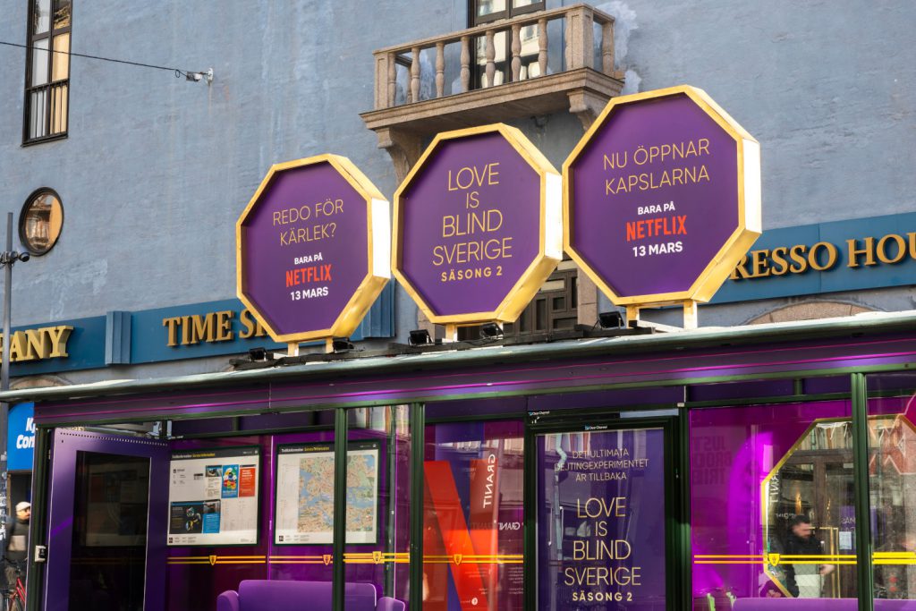Zum Start der zweiten Staffel von Love is Blind: Sweden wurden wir von einem unserer Partner beauftragt, die Netflix-Kampagne durch eine auffällige City-Installation zum Leben zu erwecken. Unsere Aufgabe war es, eine gewöhnliche Bushaltestelle in ein immersives Markenerlebnis zu verwandeln – mit starken visuellen Elementen und robusten Materialien, die den äußeren Bedingungen standhalten.