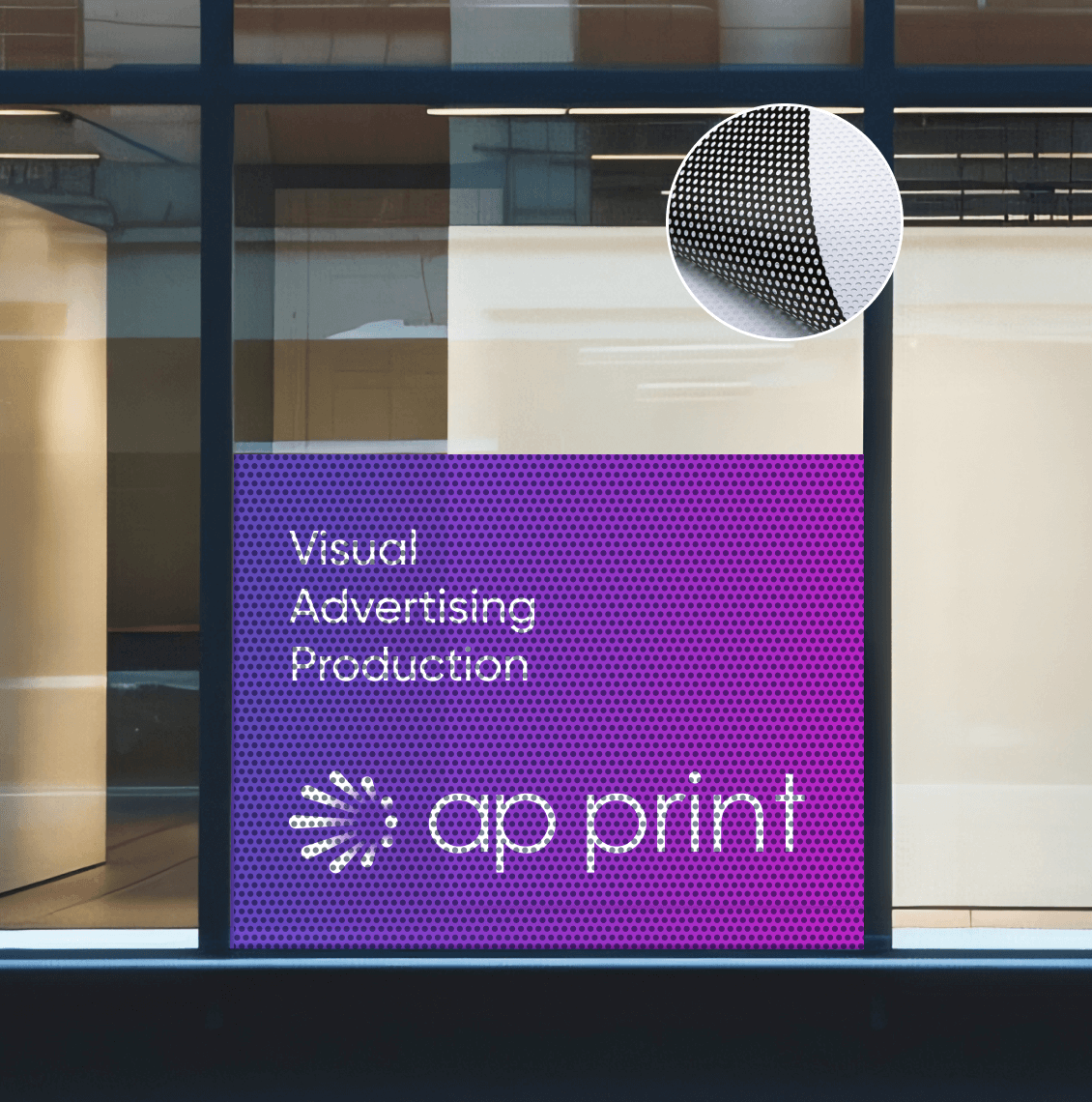 We offer a wide selection of perforated window films that allow clients to create impactful one-way vision graphics. This self-adhesive film features micro-perforations, enabling printed graphics to remain visible from the outside while preserving visibility from the inside. One-way vision film is ideal for flat glass surfaces and is commonly used for window advertising, as it lets natural daylight enter the room even when fully applied.